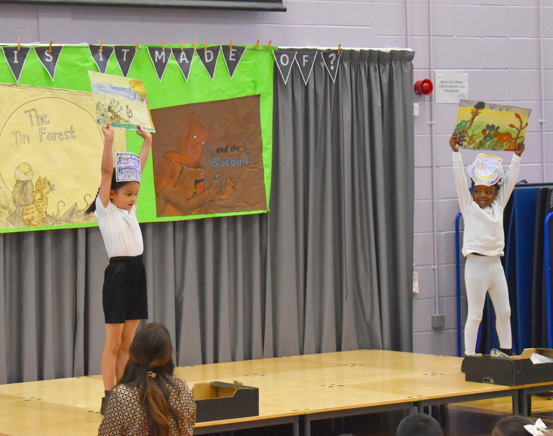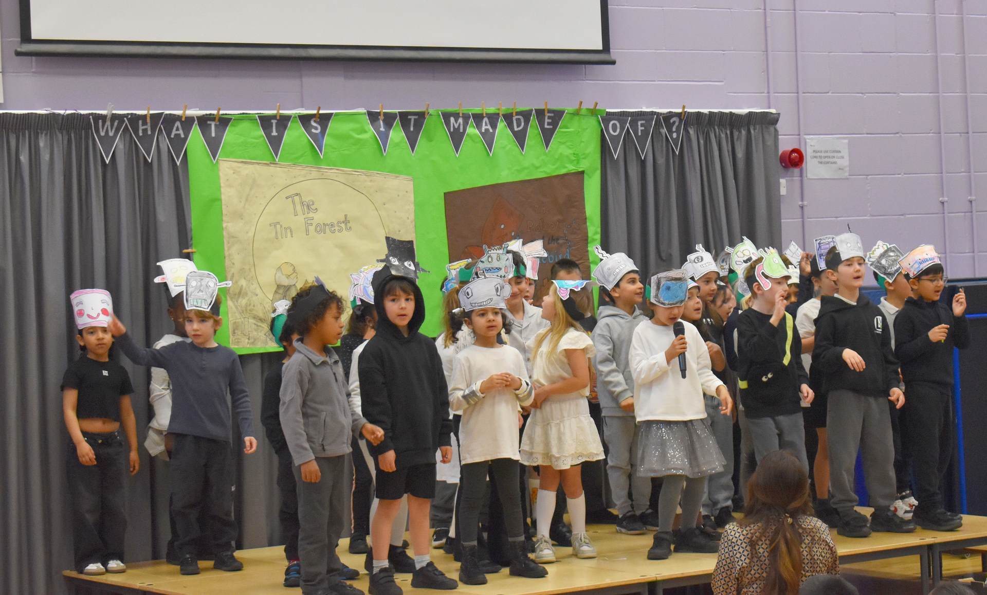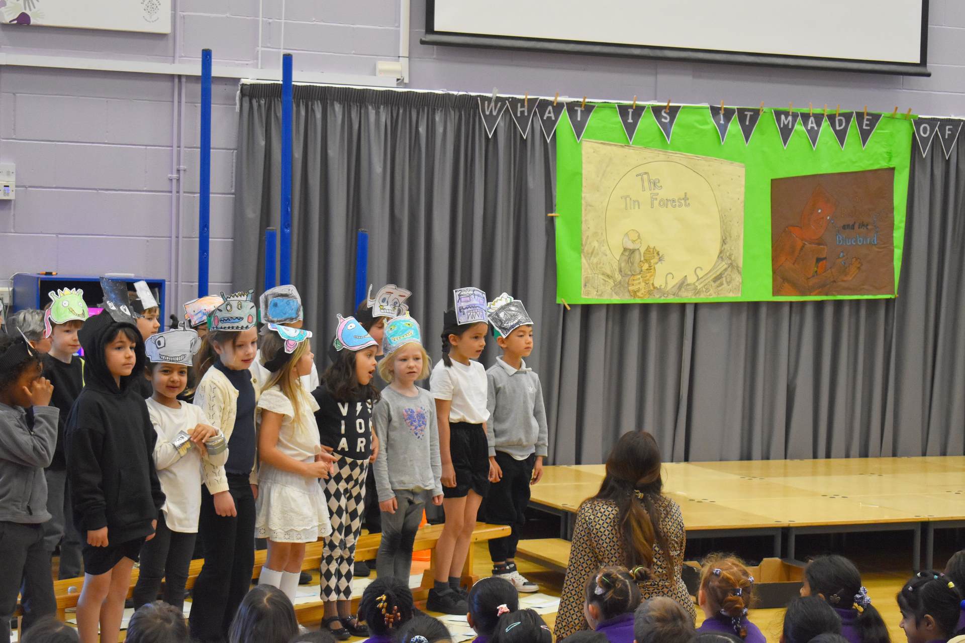 We were treated to 1W’s class assembly on Friday, ‘What is it made of.’ Wow what an information packed assembly it was too! The children had done so many things based around the story of ‘The Tin Forest,’ by Helen Ward and Wayne Anderson. This is the story of a man who dreams of a real forest and builds one out of tin until finally one day it becomes a real place with trees, birds and animals.