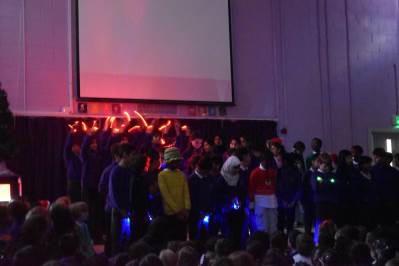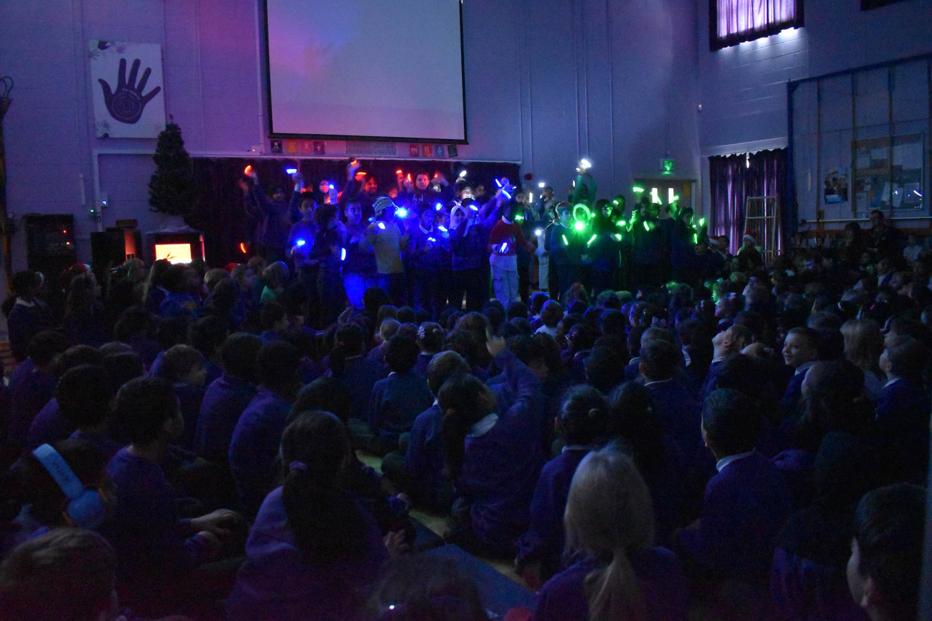 The choir supported us all and guitars and ukuleles accompanied with great renditions of our most popular carols whilst wearing very cool sunglasses. Well done to all those children! The Choir did a brilliant job in supporting us all with our Makaton signs for the songs and Year 4 entertained us with a fantastic hand jive. A particular highlight of the concert had to be Year 6’s amazing light show to music – just WOW!
