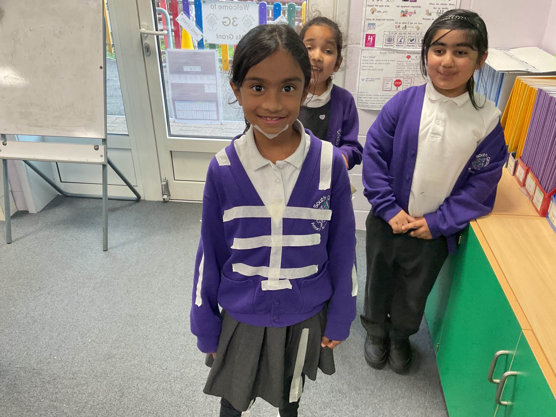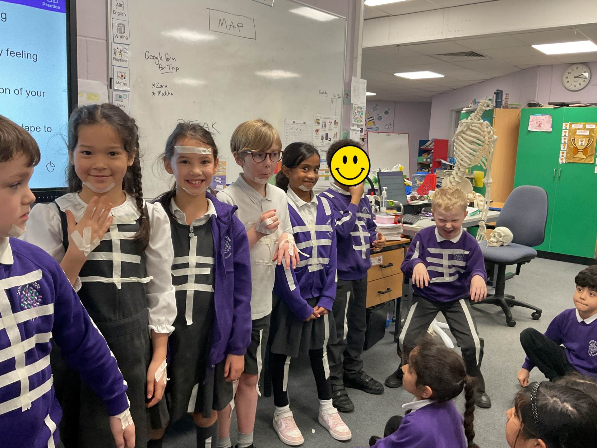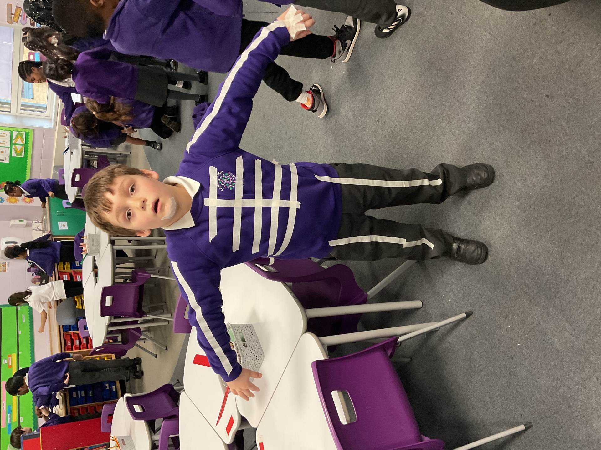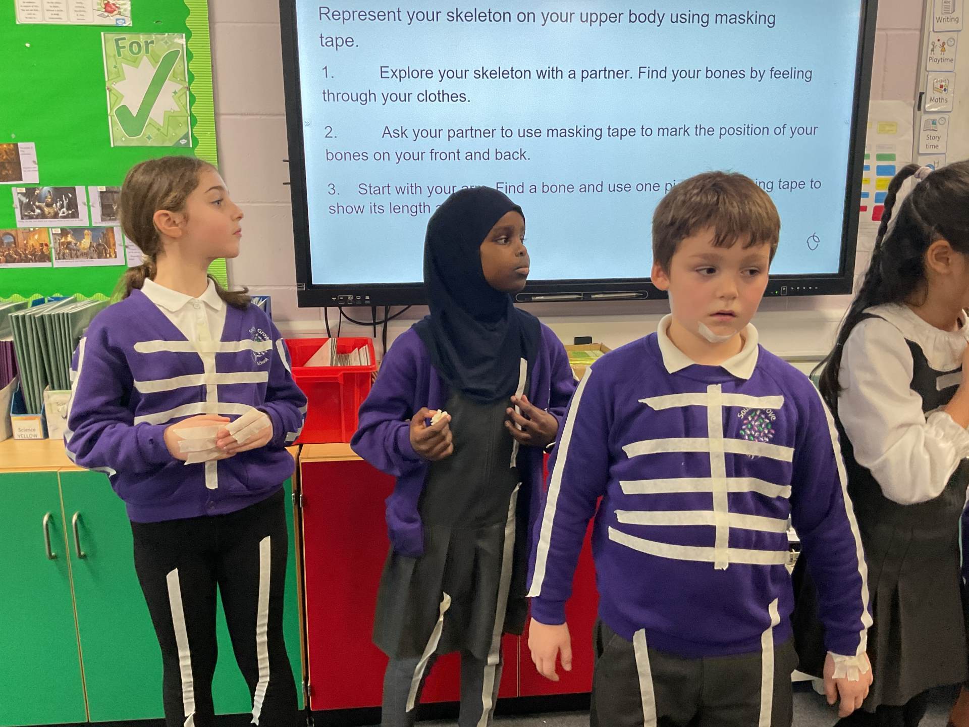 In our science topic we have been learning about the human body focusing on the skeleton. We discussed how when we are first born, we have 300 bones in our body and that they fuse together over time to create the 206 we have by early adulthood. Our skeleton helps us to move, stay standing and protects many of our vital organs. We used masking tape to map our skeleton on our body.