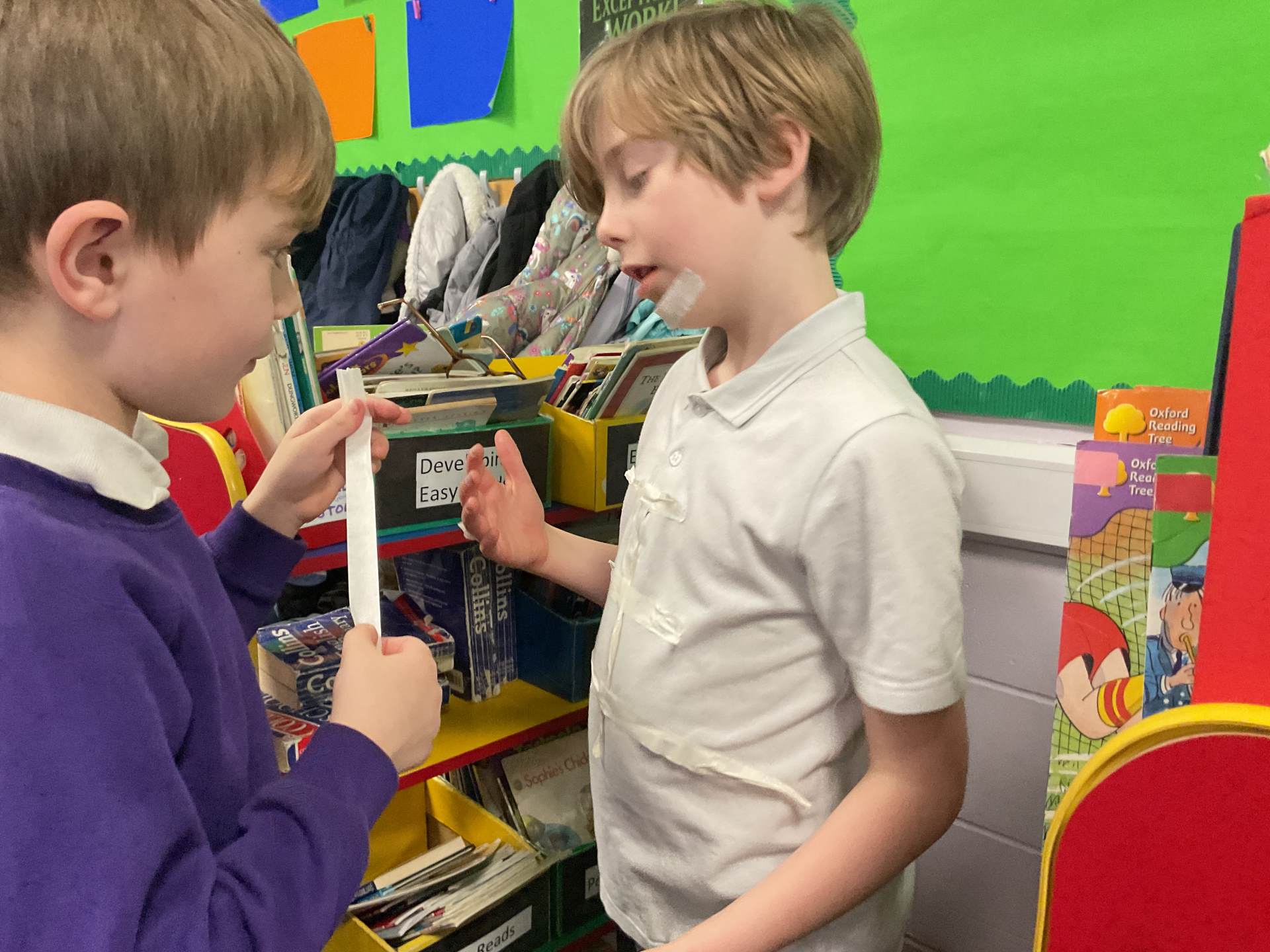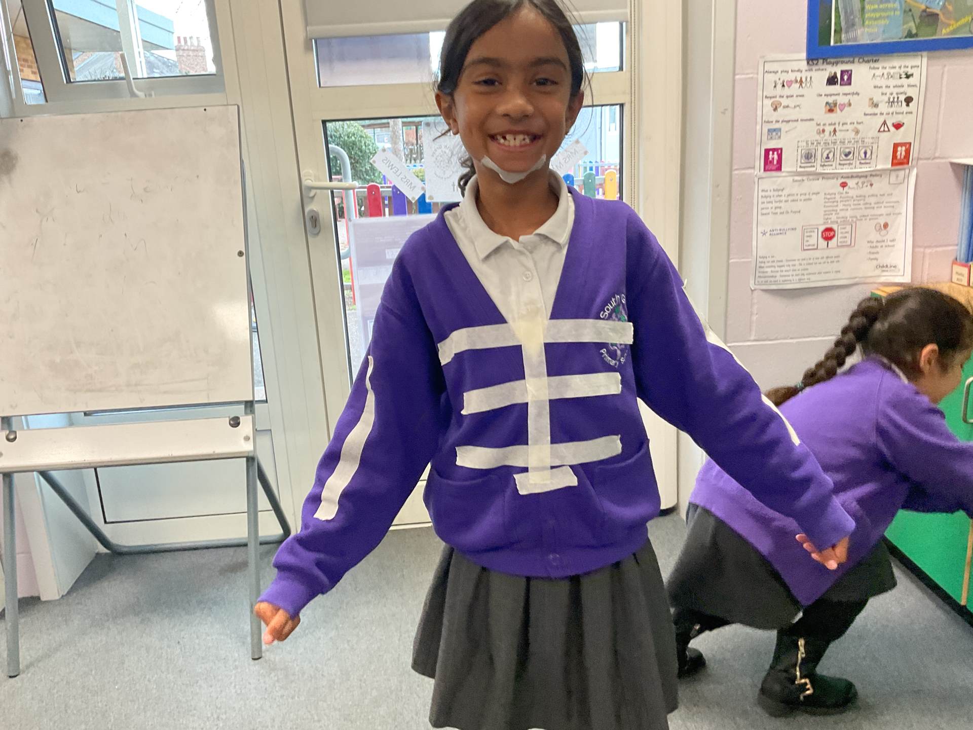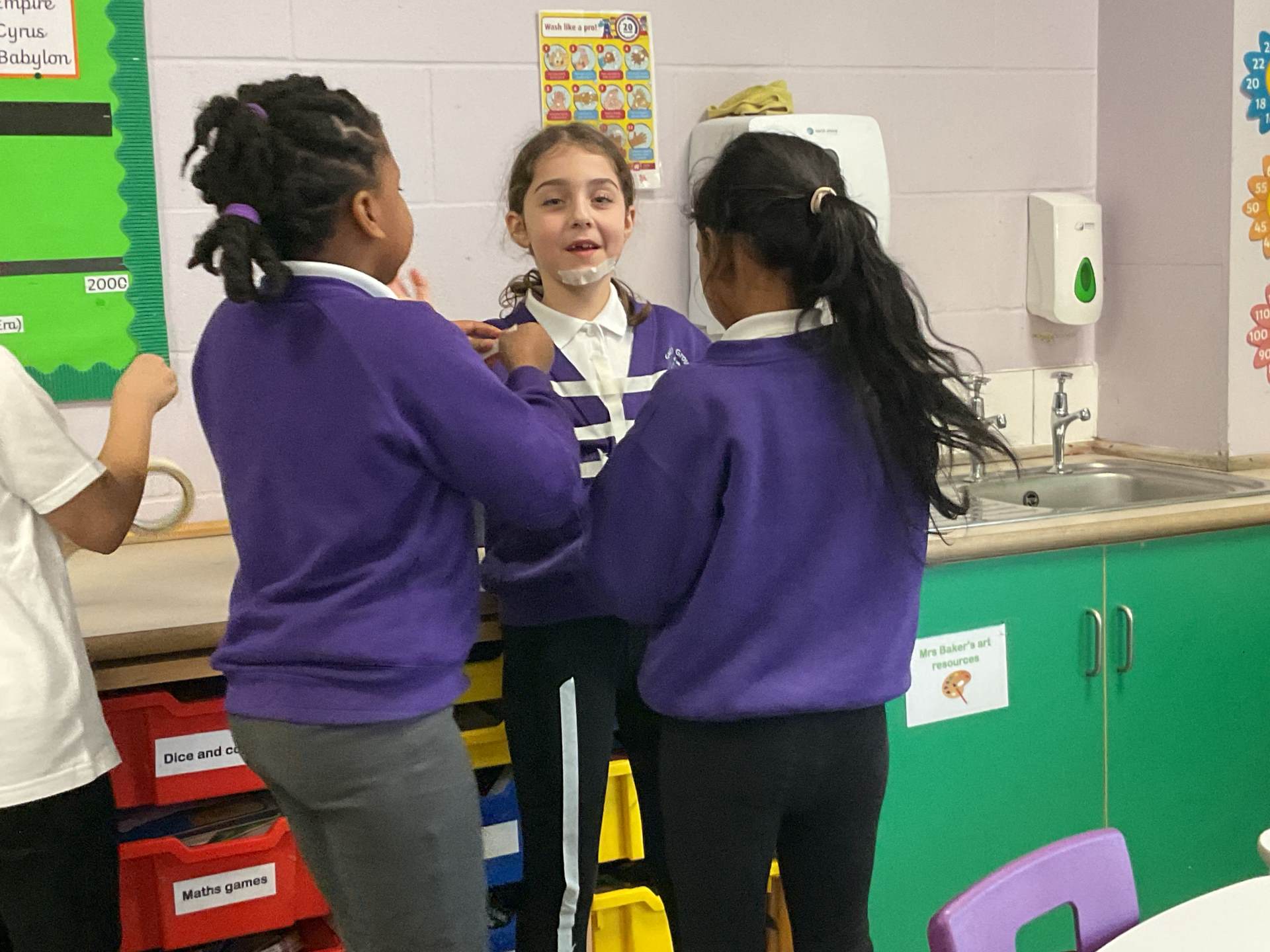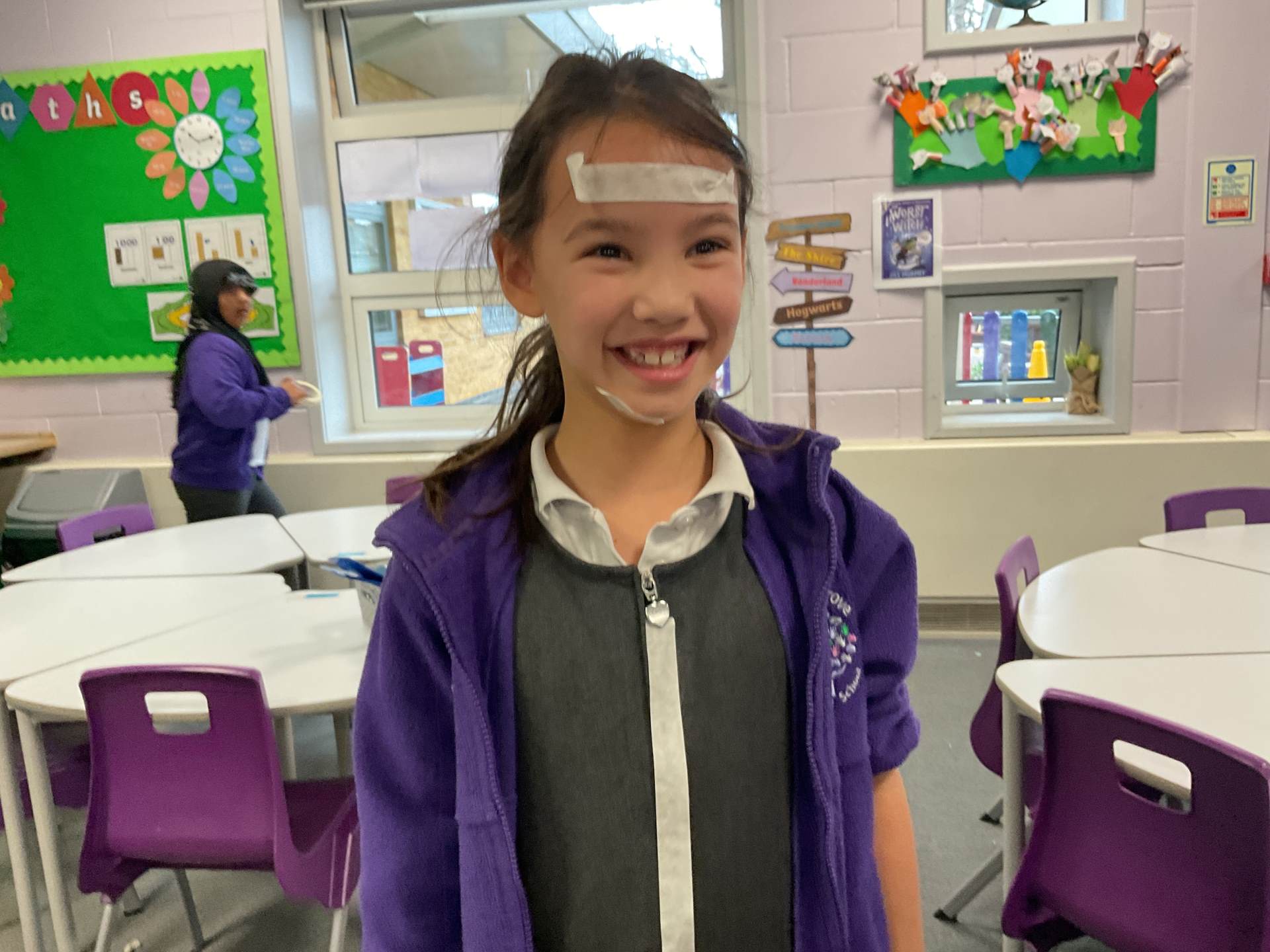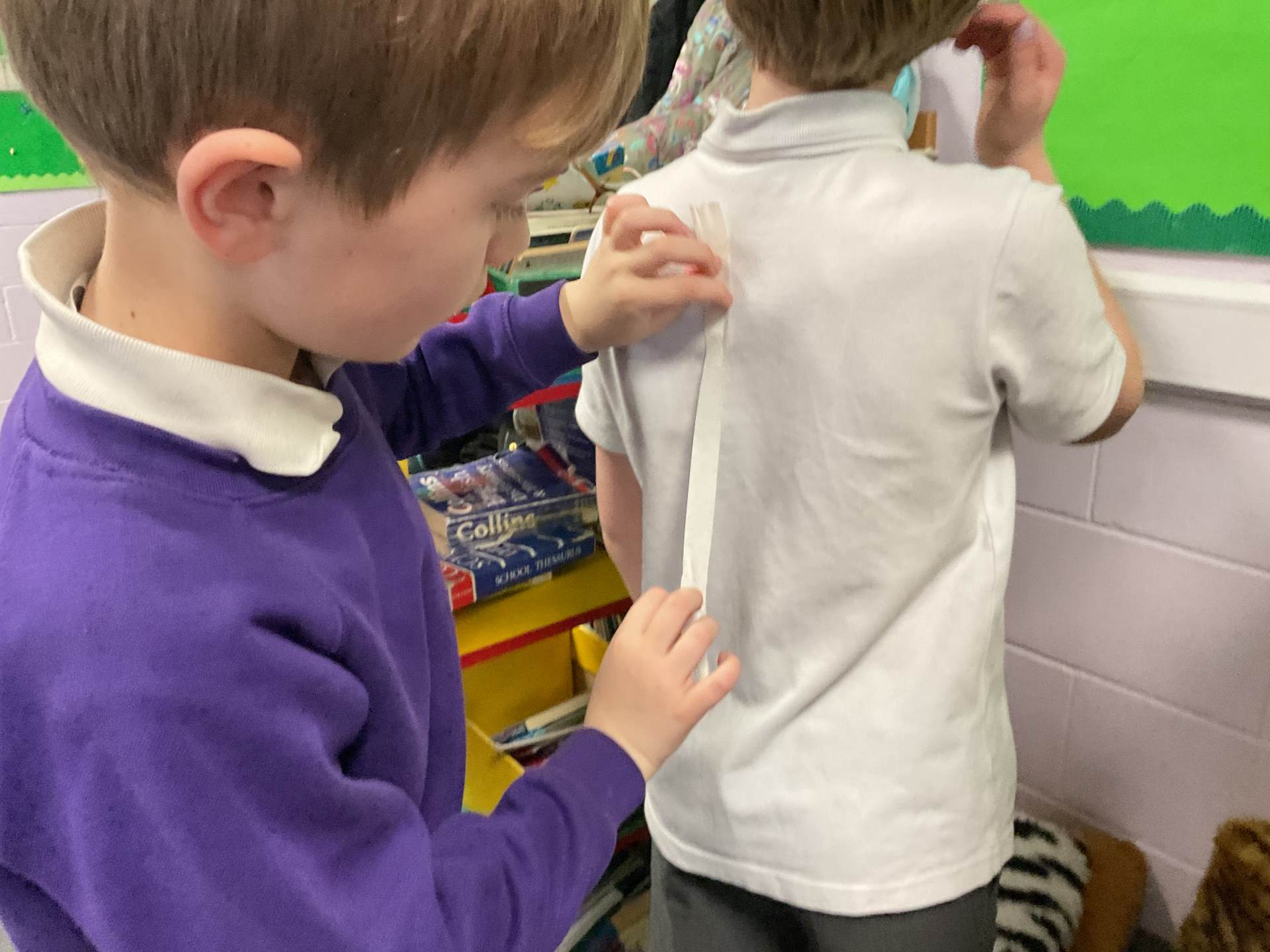 In our science topic we have been learning about the human body focusing on the skeleton. We discussed how when we are first born, we have 300 bones in our body and that they fuse together over time to create the 206 we have by early adulthood. Our skeleton helps us to move, stay standing and protects many of our vital organs. We used masking tape to map our skeleton on our body.