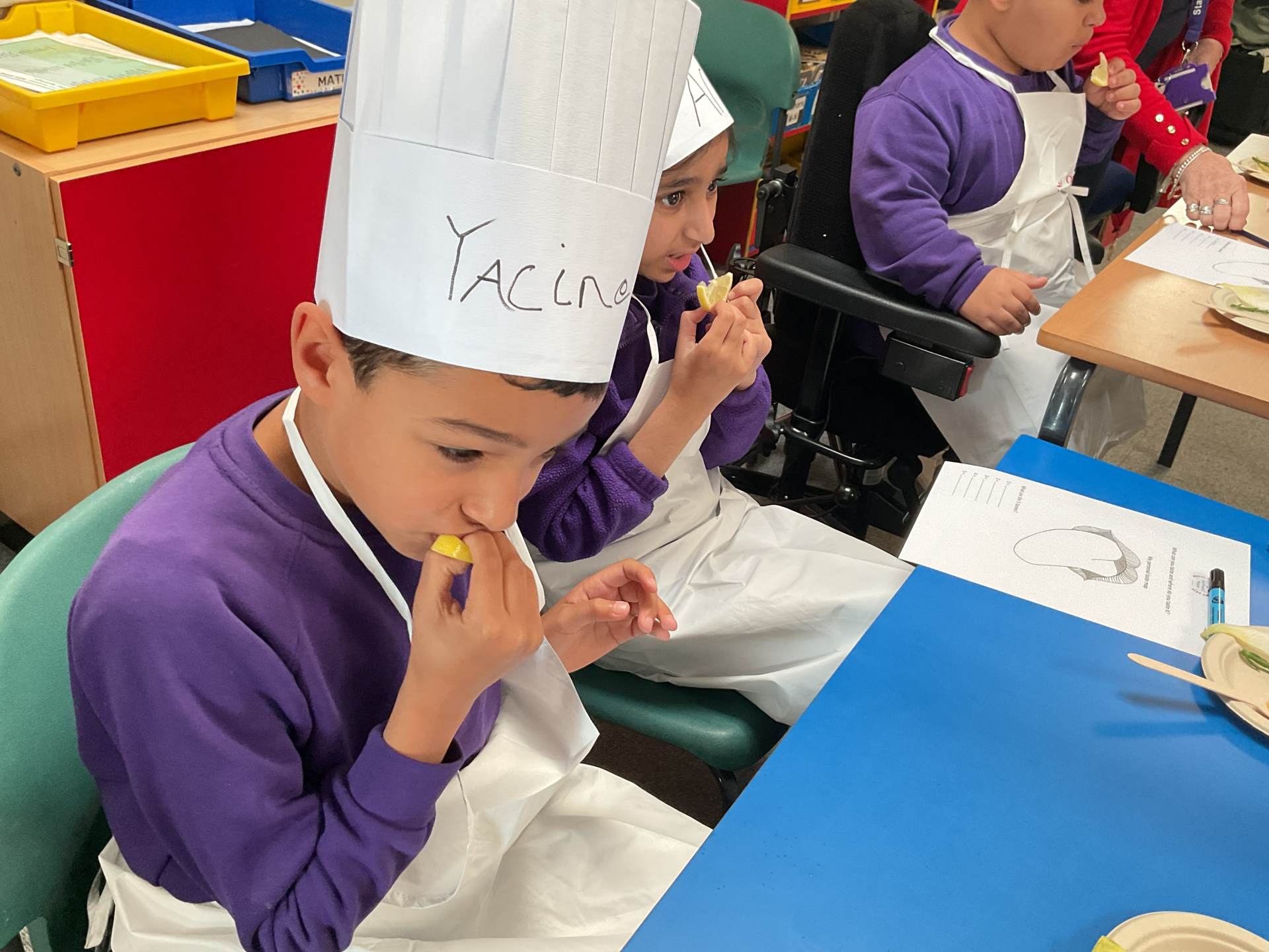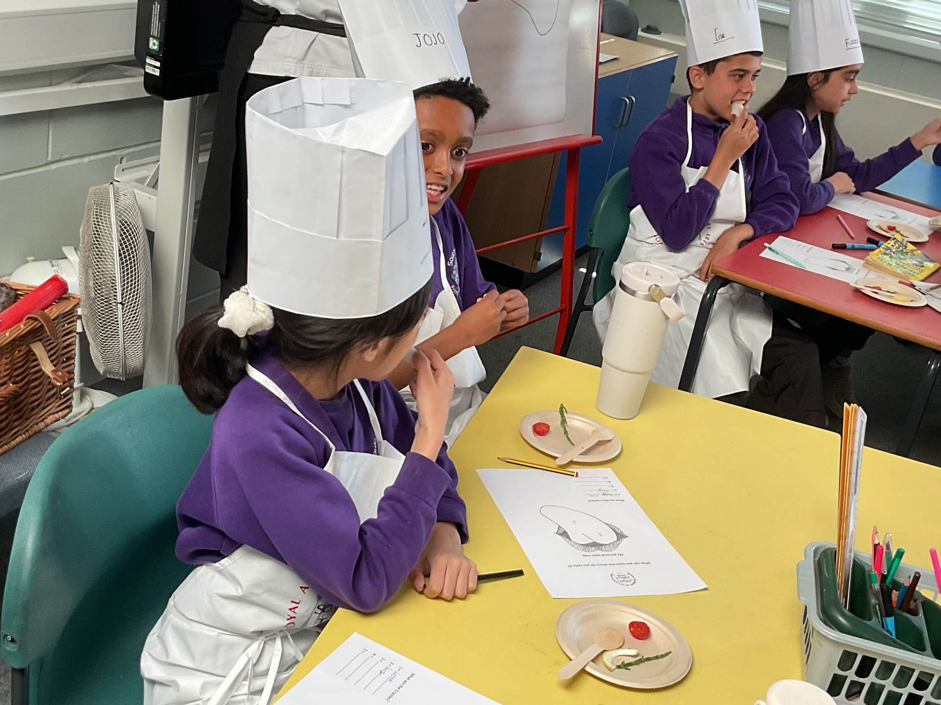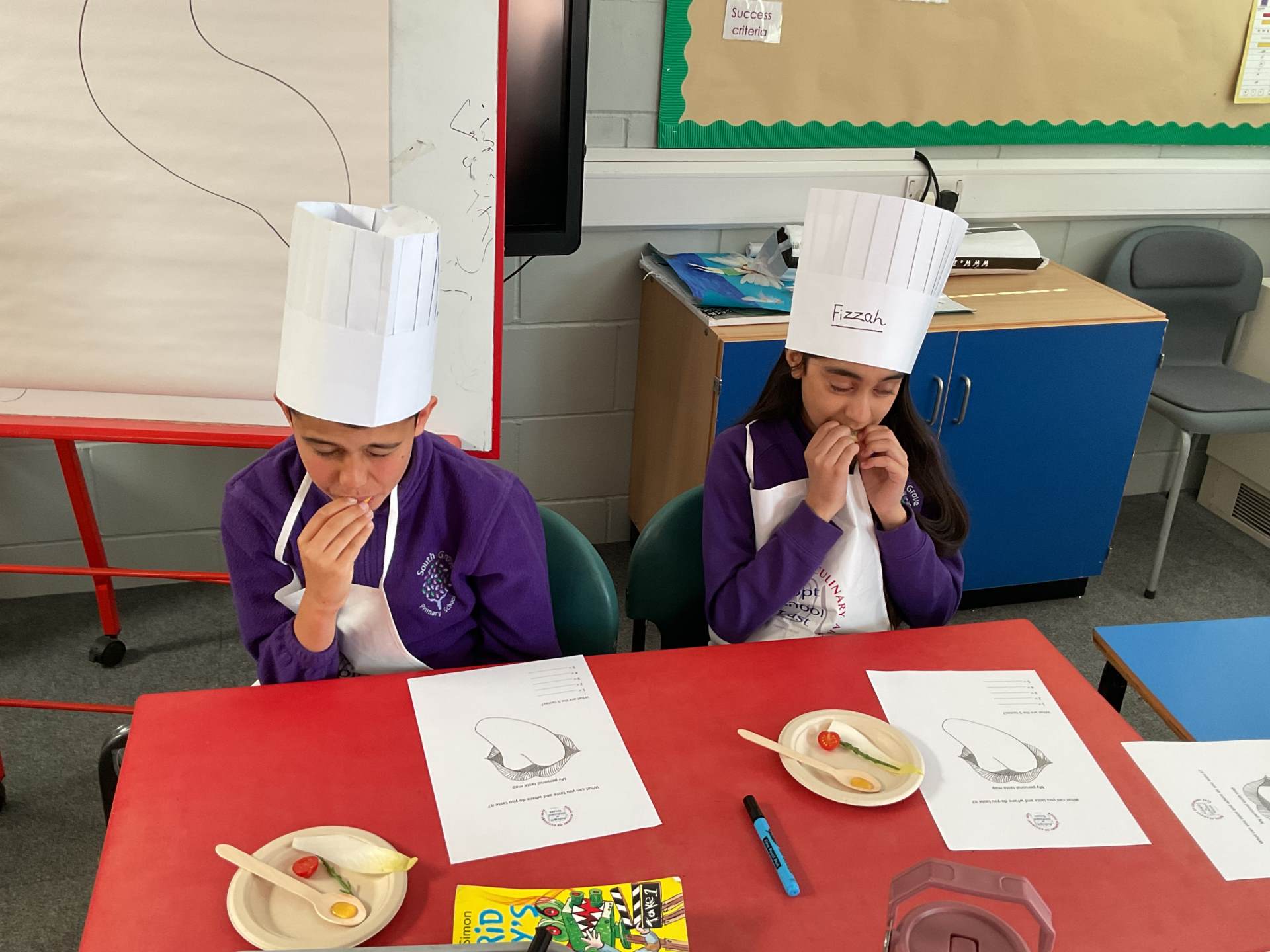 To finish, the children enjoyed a tasting session where they were encouraged to try a range of foods. They used their senses to explore flavours, describing what they tasted and where they noticed the flavours most on their tongues. The children proudly wore their hats and aprons and are already looking forward to the rest of the sessions.