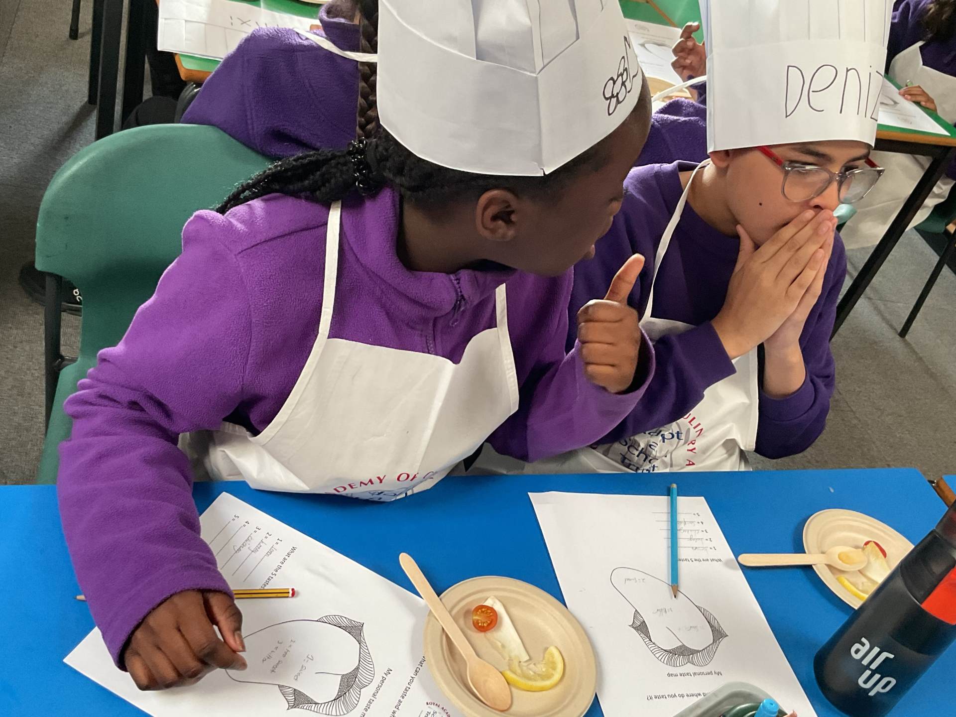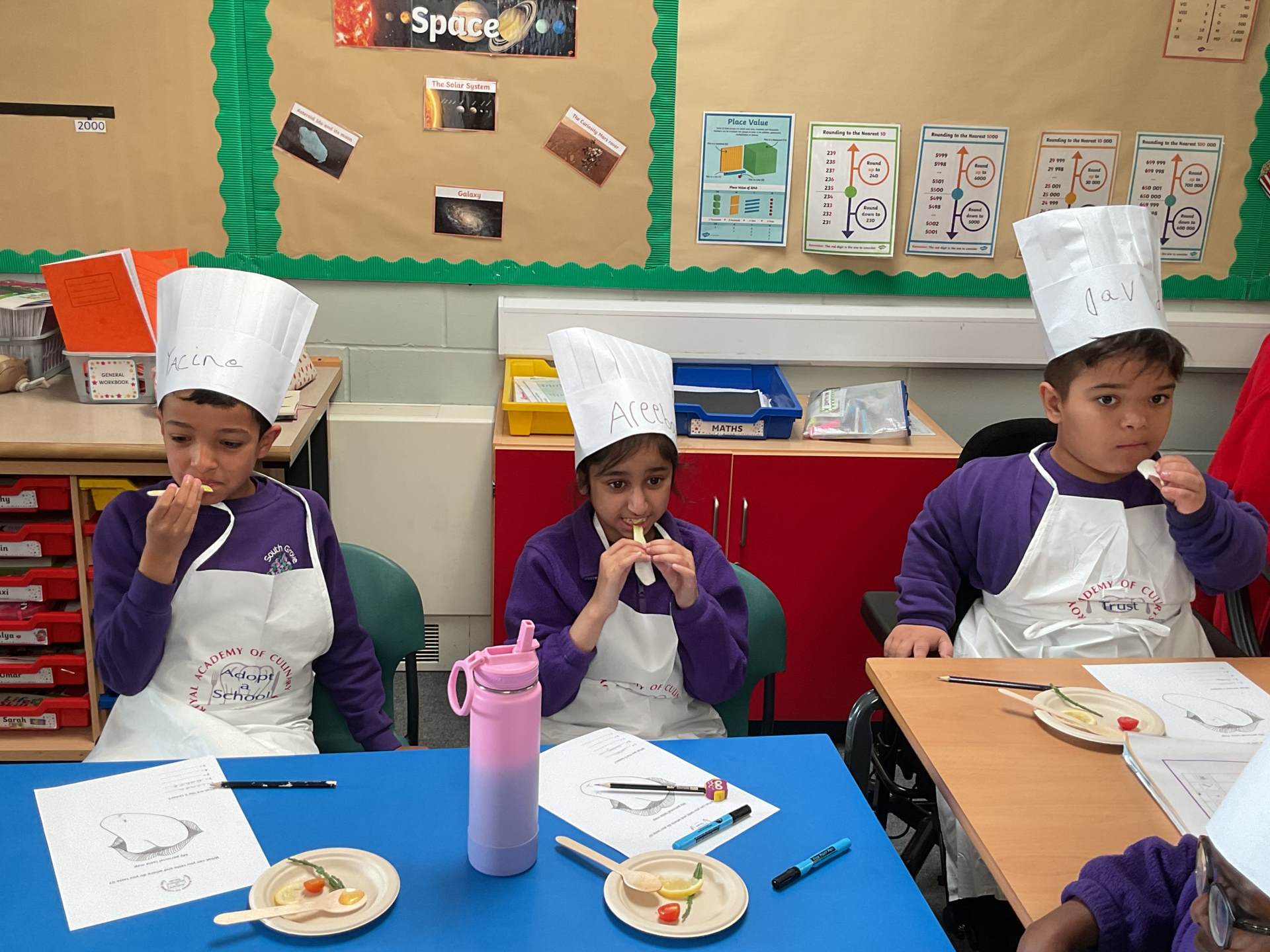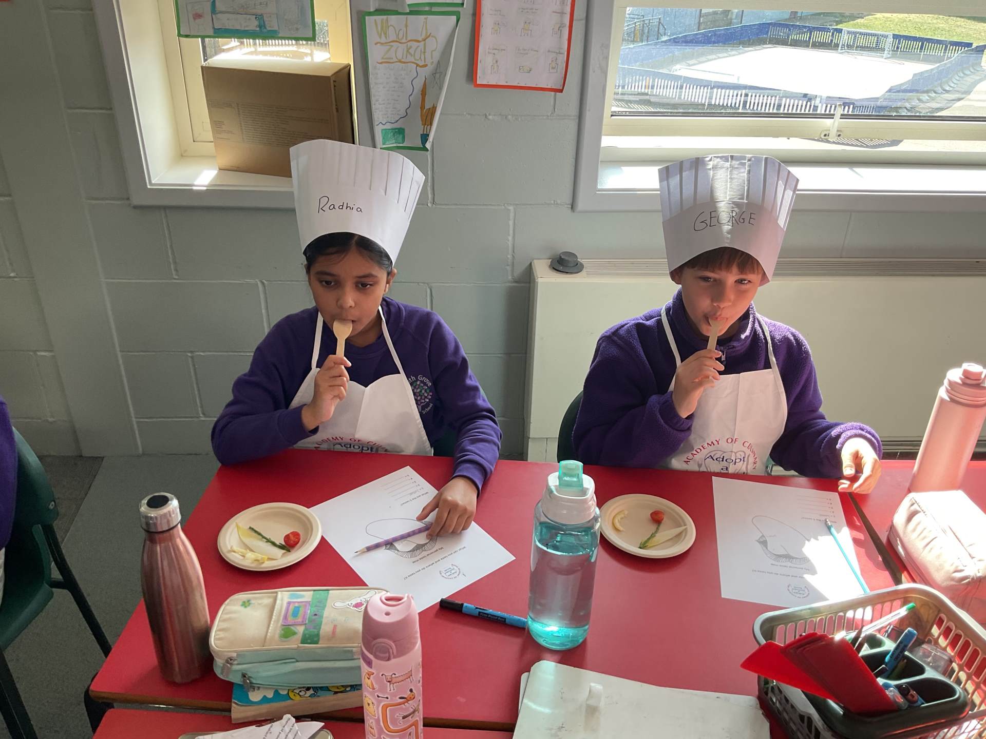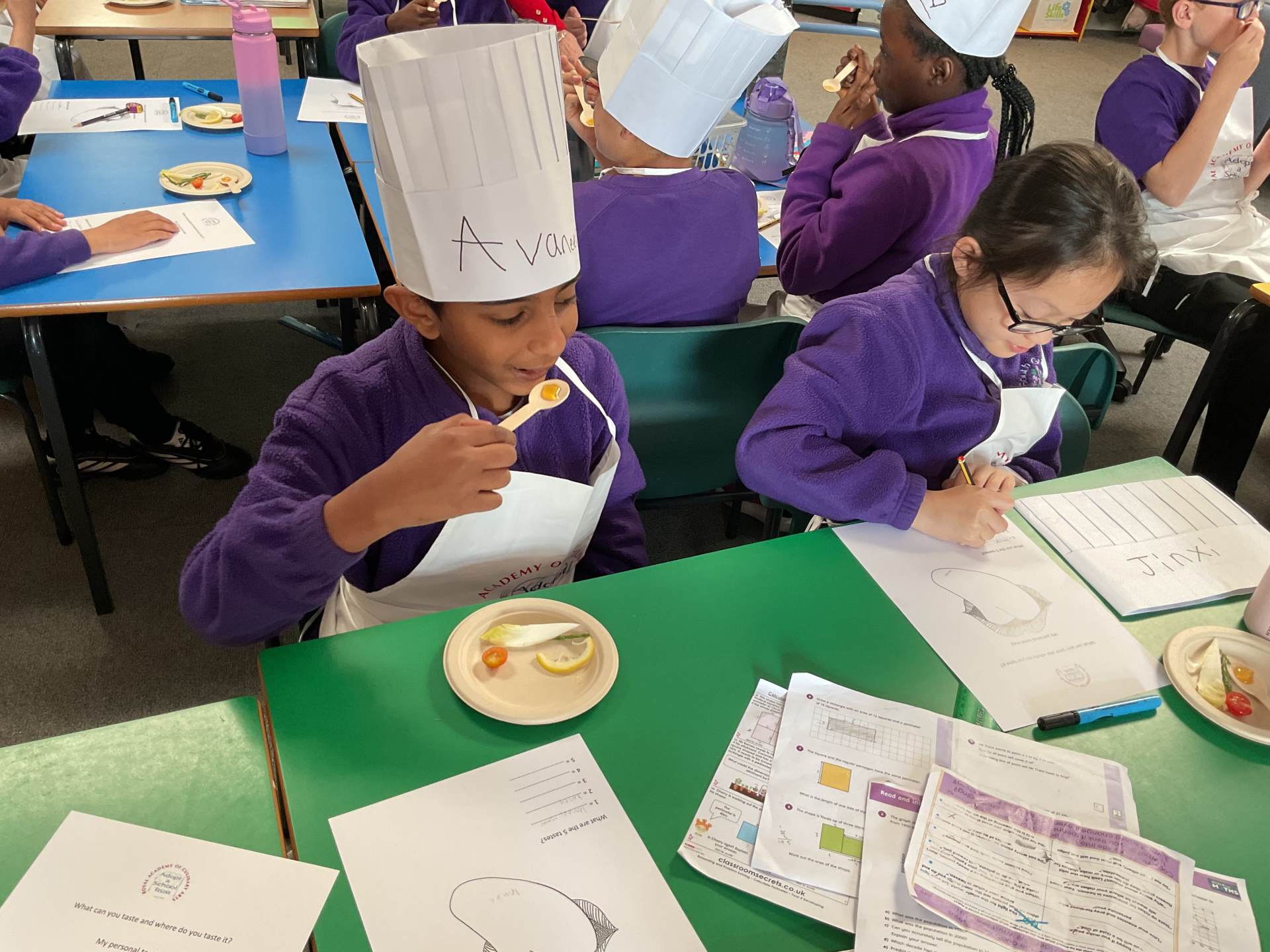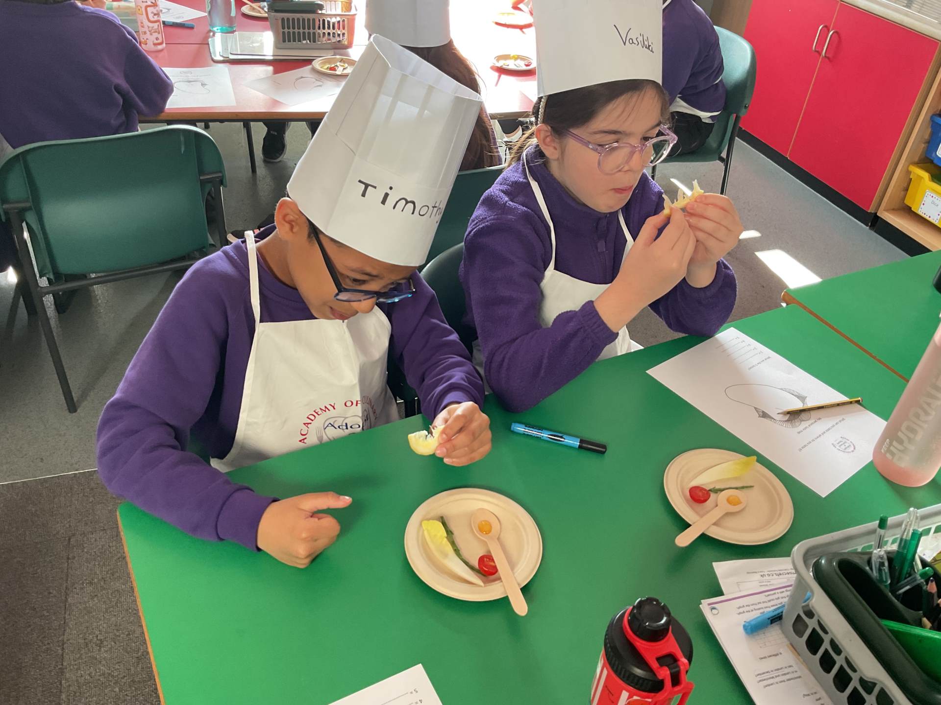 Year 5 took part in their first Adopt a School Chef session, where they explored a variety of unfamiliar foods, including chicory, samphire and rhubarb. They learned about the Eatwell Guide, identifying different food groups and discussing why each is important for a healthy diet. The session also introduced seasonal fruits and vegetables, helping the children understand what seasonal means and why it matters.